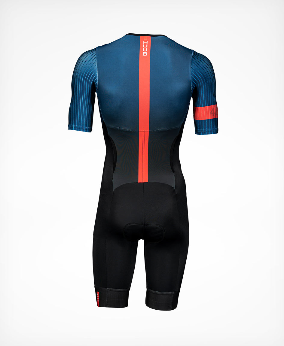 It also features aerodynamic rear-side access pockets large enough to contain nutrition and race essentials. The chamois pad has been developed over years and provides cushioning where needed whilst in the TT position, yet is still minimal so that you are not encumbered when running. The suit has a performance fit which adds to the aerodynamic qualities of the suit, with printed silicone grippers keeping the suit in place on the legs and folded cuffs on the sleeve providing a comfortable fit.